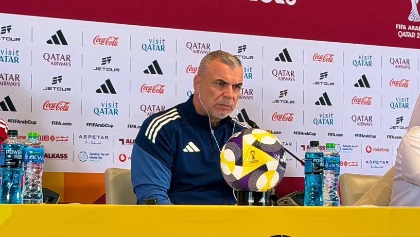 مدرب الإمارات كوزمين أولاريو خلال مؤتمر صحفي في كأس العرب - 14 ديسمبر 2025 - X/@aawsat_spt