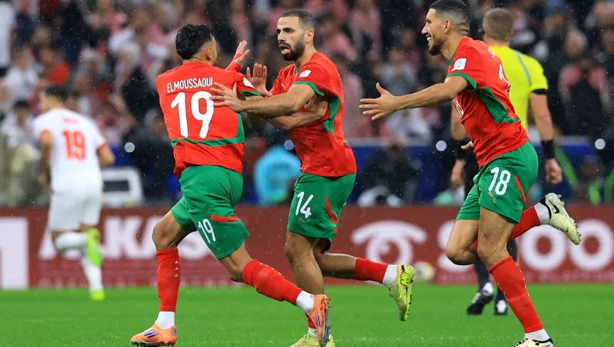 أسامة طنان لاعب المغرب (في المنتصف) يحتفل مع زملائه بهدفه أمام الأردن في نهائي كأس العرب - 18 ديسمبر 2025 - Reuters