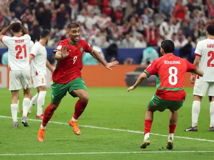 عبد الرزاق حمد الله مهاجم المغرب يحتفل بالهدف الثالث أمام الأردن في نهائي كأس العرب - 18 ديسمبر 2025 - Reuters