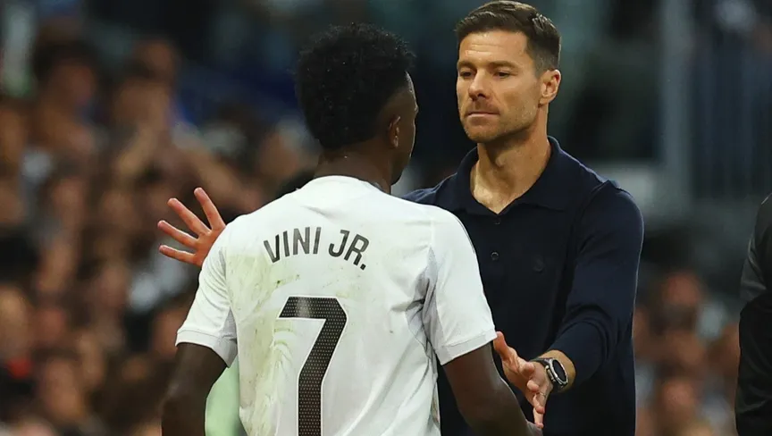 مدرب ريال مدريد تشابي ألونسو مع فينيسيوس جونيور خلال مباراة بين ريال مدريد وبرشلونة - 26 أكتوبر 2025 - REUTERS