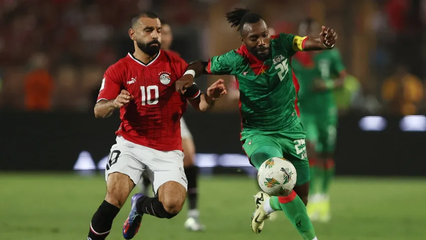 محمد صلاح في صراع على الكرة مع ستيف ياغو خلال مباراة بين مصر وبوركينا فاسو في تصفيات كأس العالم - 6 يونيو 2024 - Reuters