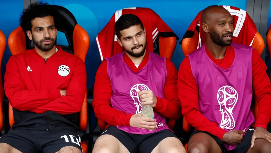 شيكابالا وسام مرسي ومحمد صلاح خلال مباراة مصر وأوروغواي بكأس العالم 2018 - 15 يونيو 2018 - Reuters