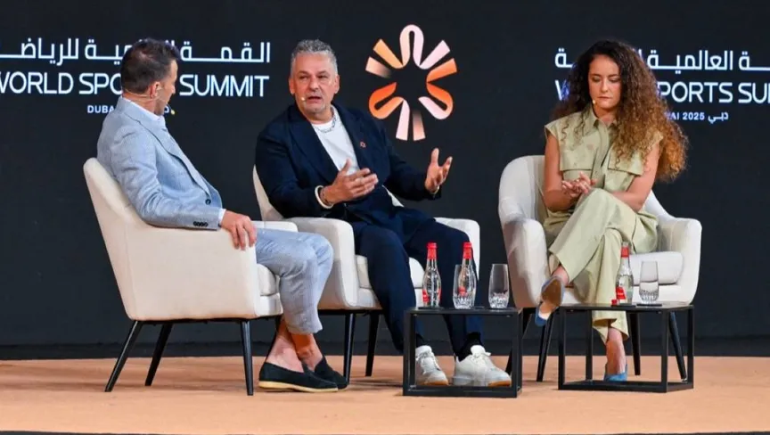 روبرتو باجيو (وسط) وابنته فالنتينا (يمين) في حوار مع أليساندرو ديل بييرو في القمة العالمية للرياضة بدبي - 30 ديسمبر 2025 - X/@AlBayanSports