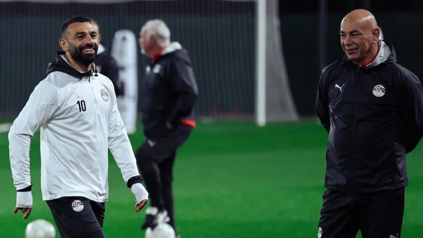 المدرب حسام حسن رفقة محمد صلاح في حصة تدريبية لمنتخب مصر - 8 يناير 2026 - X/@EFA
