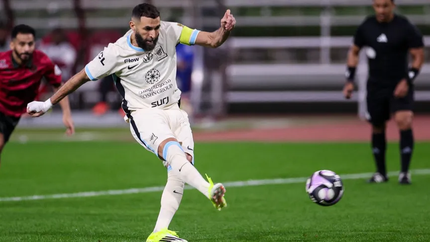 شاهد.. كريم بنزيما يسجل "هاتريك" في الشوط الأول من لقاء الاتحاد والخلود