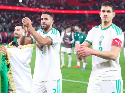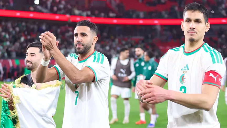 عيسى ماندي رفقة رياض محرز ومحمد أمين عمورة بعد لقاء الجزائر والكونغو الديمقراطية - 6 يناير 2026 - FB/Équipe d'Algérie de football