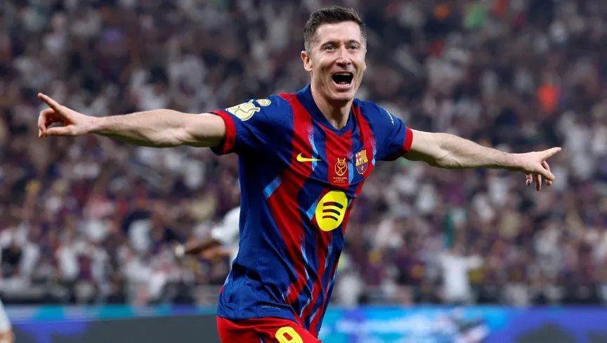روبرت ليفاندوفسكي يحتفل بهدفه أمام ريال مدريد خلال فوز برشلونة بالسوبر الإسباني في جدة - 11 يناير 2026 - Reuters