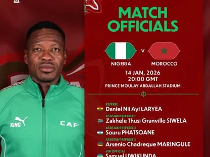 أعلن الاتحاد الإفريقي لكرة القدم أسماء طاقم التحكيم لمباراة المغرب ونيجيريا في نصف نهائي كأس أمم إفريقيا يوم الأربعاء.