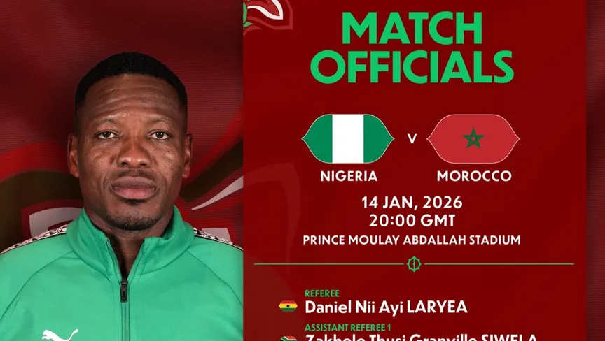 الحكم الغاني دانيال لاريا في إعلان الاتحاد الإفريقي لكرة القدم عن طاقم التحكيم لمباراة المغرب ونيجيريا في نصف نهائي كأس أمم إفريقيا 2025 - 13 يناير 2026 - X@CAF_Media