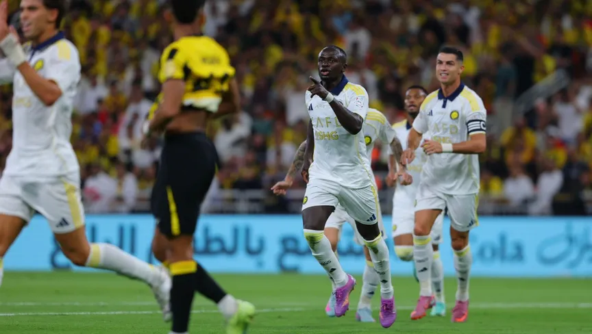احتفال ساديو ماني مهاجم النصر بتسجيل هدف في مرمى الاتحاد بكلاسيكو الدوري السعودي - 26 سبتمبر 2025 - X/@AlNassrFC