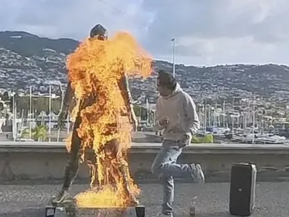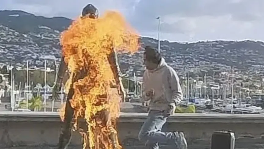وظهر في الفيديو شاب يصور نفسه خلال سكب مادة قابلة للاشتعال على النسخة البرونزية لتمثال رونالدو، قبل أن يشعلها باستخدام ولاعة.