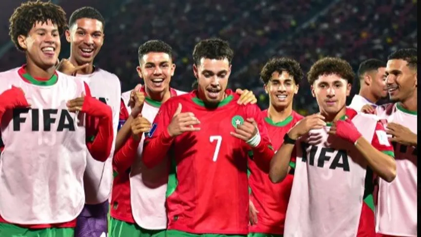 عثمان ماعما يحتفل مع لاعبي المغرب بهدف ضد البرازيل في مونديال الشباب - 1 أكتوبر 2025 - X/@EnMaroc