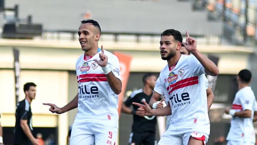 ناصر منسي مهاجم الزمالك يحتفل مع نبيل عماد "دونجا" بهدف الزمالك أمام الجونة بالدوري المصري - 27 يناير 2025 - x@ZSCOfficial