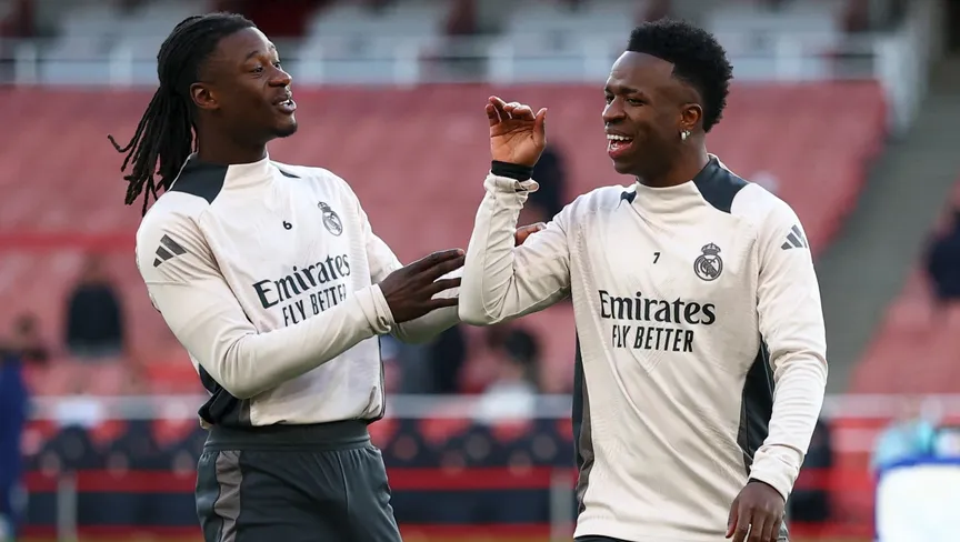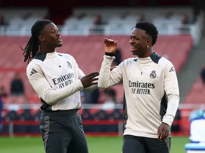 فينيسيوس جونيور وإدواردو كامافينغا خلال تدريب لريال مدريد على ملعب "الإمارات" قبل مواجهته أرسنال في دوري أبطال أوروبا - 7 أبريل 2025 - Reuters