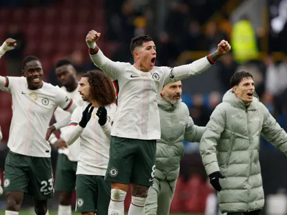 إنزو فرنانديز يحتفل مع جماهير تشيلسي بالفوز على بيرنلي في الدوري الإنجليزي الممتاز - 22 نوفمبر 2025 - Action Images via Reuters