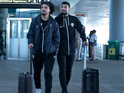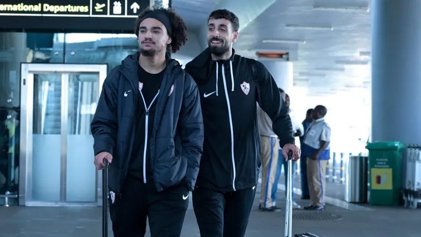 عدي الدباغ (يمين) وآدم كايد ثنائي الزمالك بعد الوصول إلى زامبيا - 6 فبراير 2026 - X/@ZSCOfficial