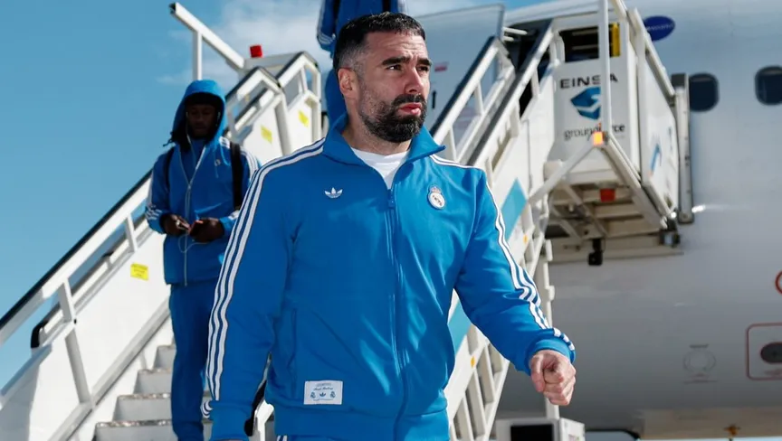 داني كارفاخال قائد ريال مدريد الإسباني يغادر الطائرة بعد الوصول إلى فالنسيا - 8 فبراير 2026 - facebook/RealMadrid