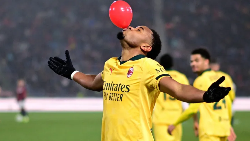 كريستوفر نكونكو مهاجم ميلان الإيطالي يحتفل بعد تسجيله هدفاً في شباك بولونيا - 3 فبراير 2026 - REUTERS