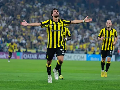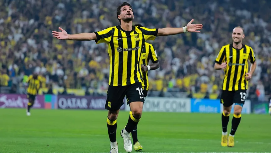 احتفال حسام عوار لاعب الاتحاد السعودي بالتسجيل في مرمى الغرافة بدوري أبطال آسيا للنخبة - 10 فبراير 2026 - X/@aawsat_spt