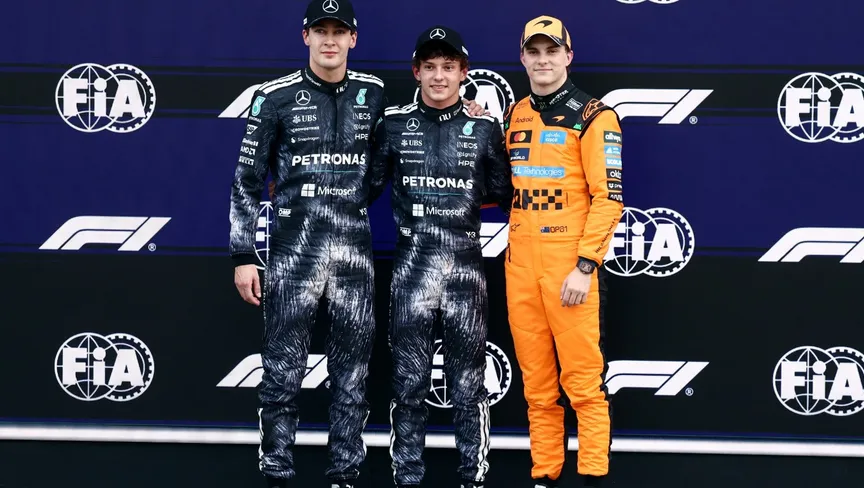 كيمي أنطونيلي (في المنتصف) سائق مرسيدس يحتفل بحصوله على مركز أول المنطلقين في جائزة اليابان لفورمولا 1 - 28 مارس 2026 - Reuters