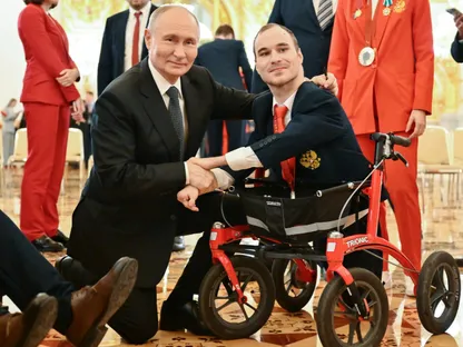 الرئيس الروسي فلاديمير بوتين مع الرياضيين الروس البارالمبيين بعد أولمبياد فرنسا - 16 ديسمبر 2024 - REUTERS